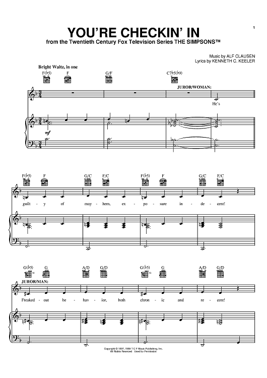 Digital Sheet Music for You're Checkin' In by Alf Clausen, Kenneth C. Keeler scored for Piano/Vocal/Chords; id:394049