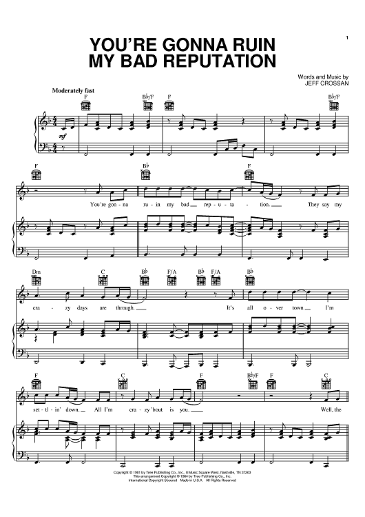 Digital Sheet Music for You're Gonna Ruin My Bad Reputation by Jeff Crossan, Ronnie McDowell scored for Piano/Vocal/Chords; id:386559