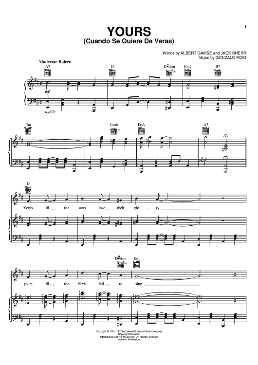 Digital Sheet Music for Yours (Cuando Se Quiere De Veras) by Albert Gamse, Gonzalo Roig, Jack Sherr scored for Piano/Vocal/Chords; id:382162