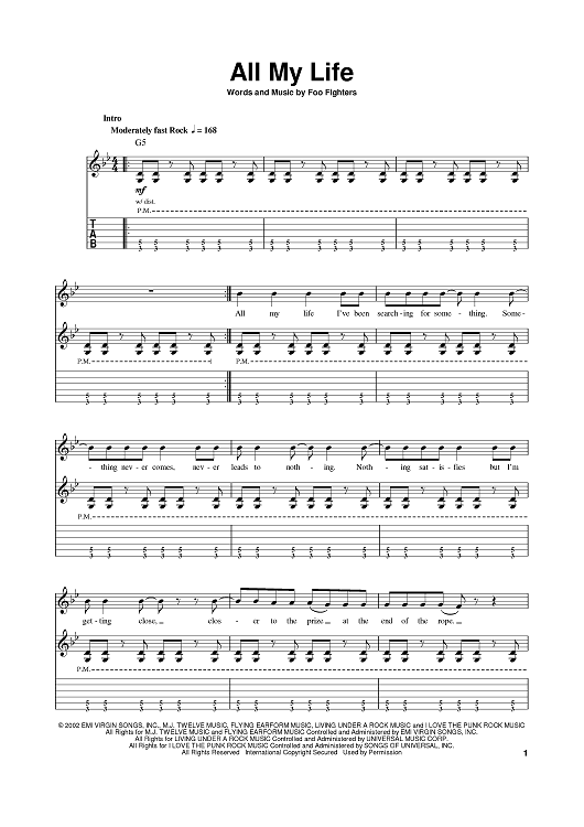Digital Sheet Music for All My Life by Foo Fighters scored for Guitar Tab; id:389870