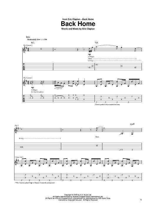 Digital Sheet Music for Back Home by Eric Clapton scored for Guitar Tab; id:389099