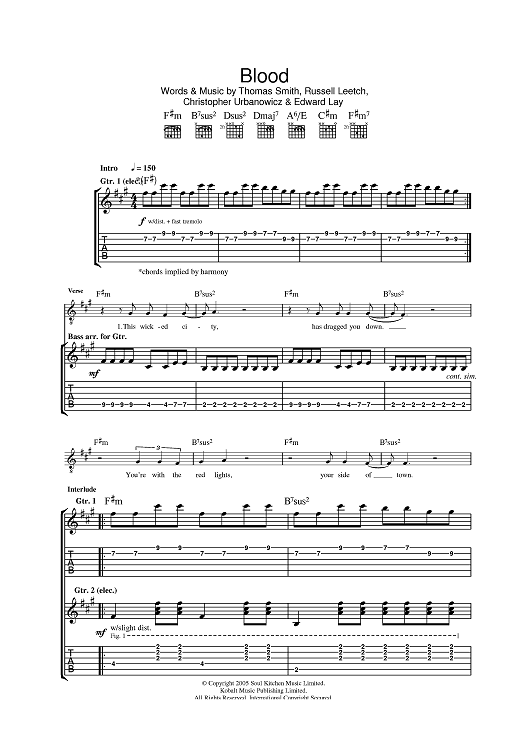 Digital Sheet Music for Blood by Editors, Ed Lay, Russell Leetch, Thomas Smith, Chris Urbanowicz scored for Guitar Tab; id:387336