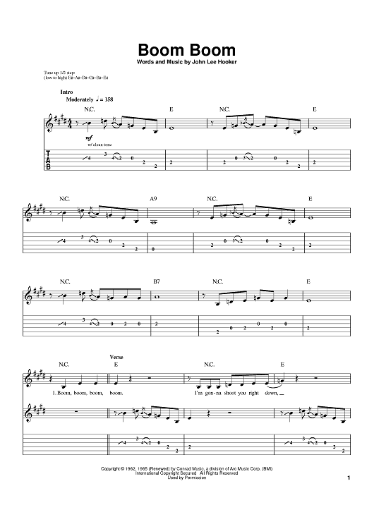 Digital Sheet Music for Boom Boom by Eric Clapton, The Animals, John Lee Hooker, Big Head Todd and the Monsters scored for Guitar Tab; id:389133