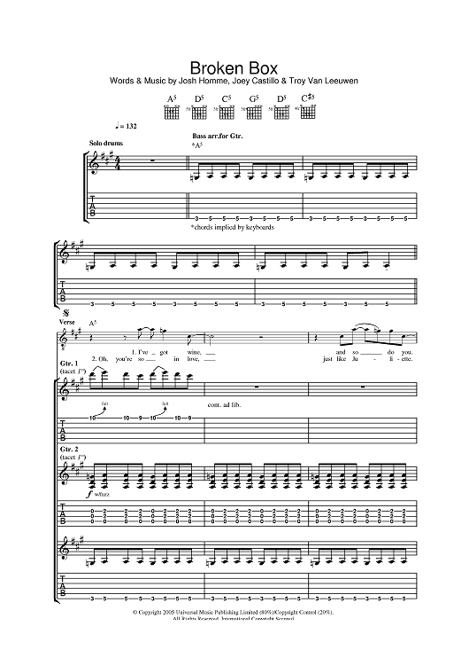 Digital Sheet Music for Broken Box by Joey Castillo, Josh Homme, Queens of the Stone Age, Troy Van Leeuwen scored for Guitar Tab; id:385438