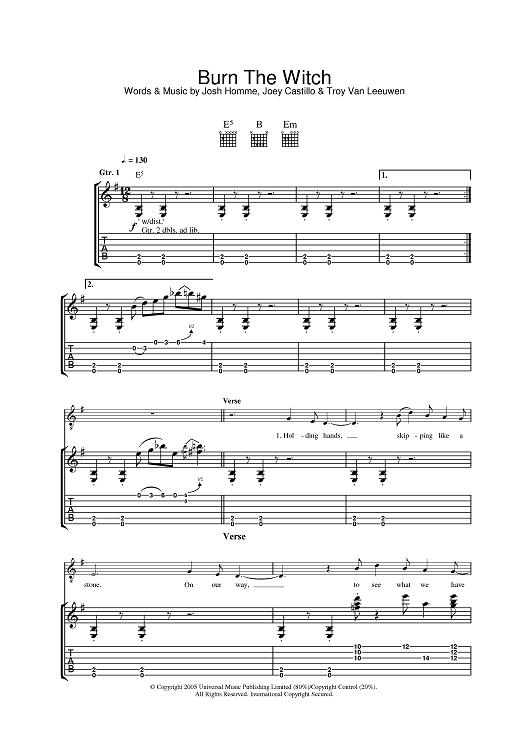 Digital Sheet Music for Burn The Witch by Joey Castillo, Josh Homme, Queens of the Stone Age, Troy Van Leeuwen scored for Guitar Tab; id:385431