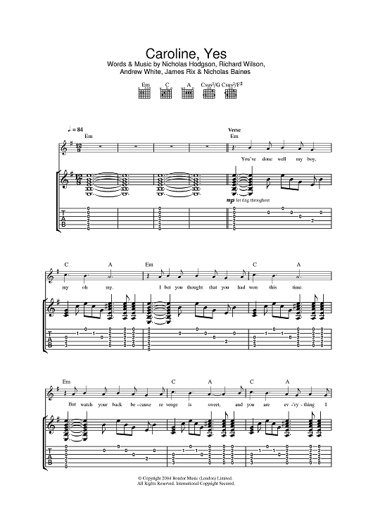 Digital Sheet Music for Caroline, Yes by Nick Baines, Nick Hodgson, Kaiser Chiefs, Simon Rix, Andrew White, Ricky Wilson scored for Guitar Tab; id:385163