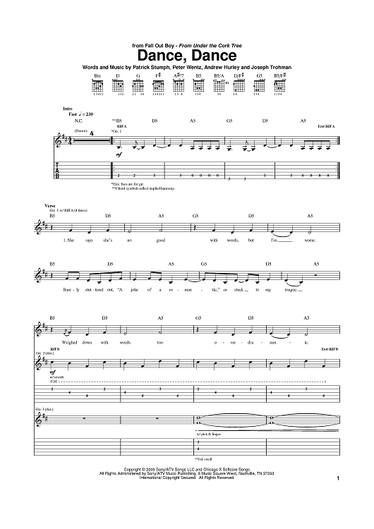 Digital Sheet Music for Dance, Dance by Patrick Stump, Peter Wentz, Andrew John Hurley, Joseph Trohman, Fall Out Boy scored for Guitar Tab; id:386336