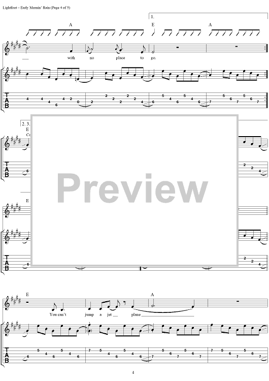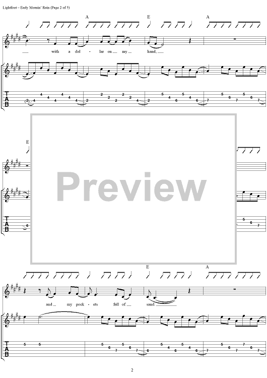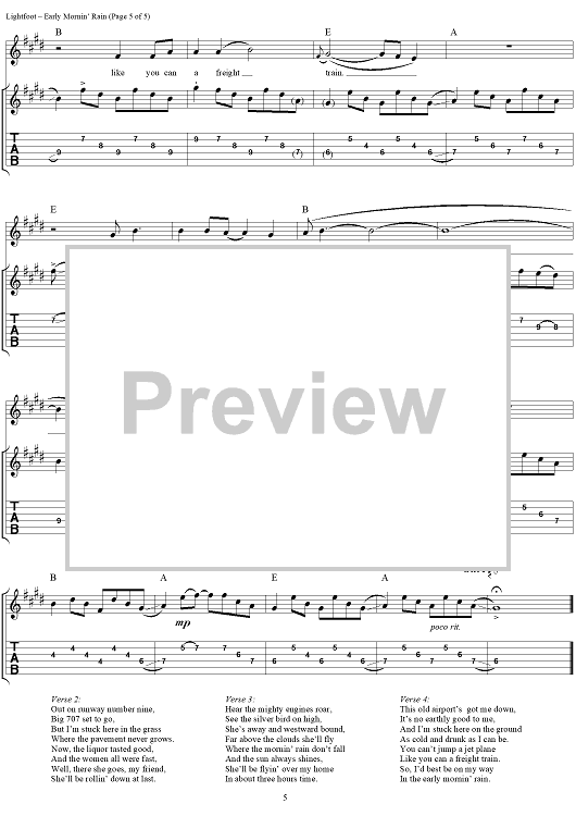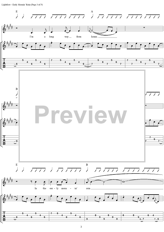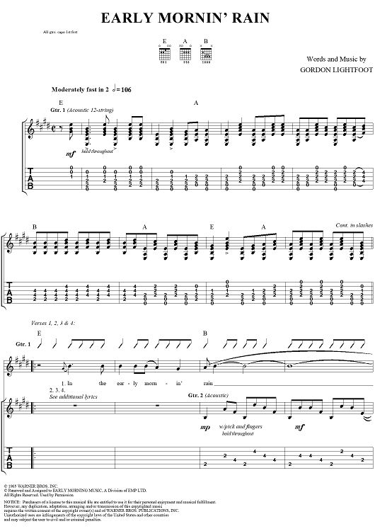 Digital Sheet Music for Early Mornin' Rain by Gordon Lightfoot scored for Guitar Tab/Vocal; id:285458