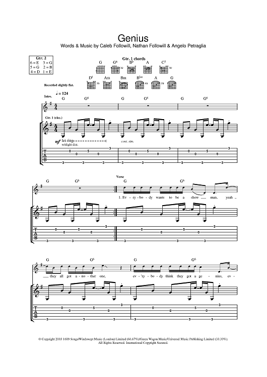 Digital Sheet Music for Genius by Angelo Petraglia, Caleb Followill, Nathan Followill, Kings of Leon scored for Guitar Tab; id:382646