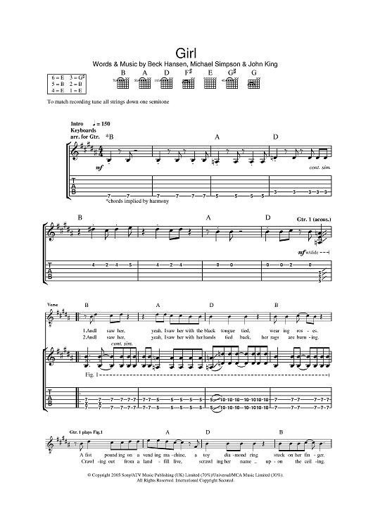 Digital Sheet Music for Girl by Michael Simpson, John King, Beck scored for Guitar Tab; id:387332