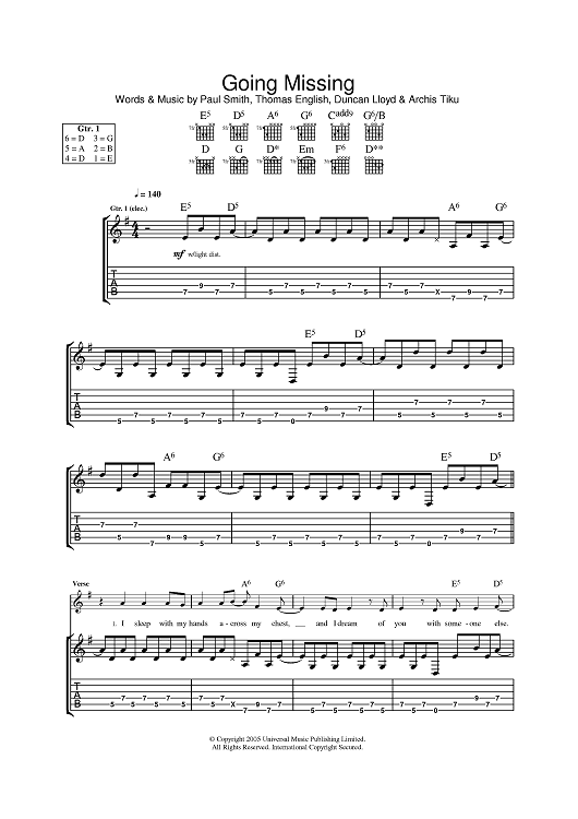 Digital Sheet Music for Going Missing by Thomas English, Duncan Lloyd, Maxïmo Park, Paul Smith, Archis Tiku scored for Guitar Tab; id:387331