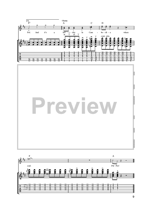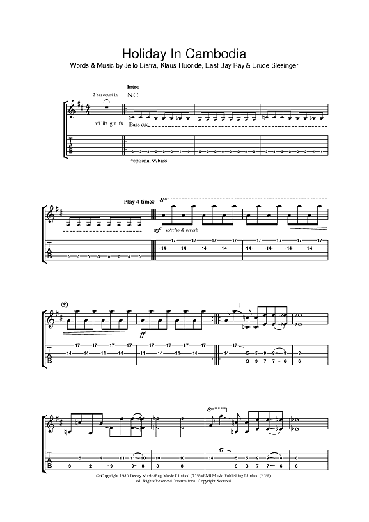 Digital Sheet Music for Holiday In Cambodia by Jello Biafra, Dead Kennedys, Klaus Fluoride, East Bay Ray, Bruce Slesinger scored for Guitar Tab; id:383943