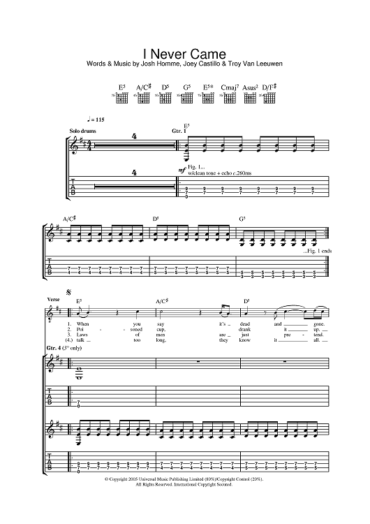 Digital Sheet Music for I Never Came by Joey Castillo, Josh Homme, Queens of the Stone Age, Troy Van Leeuwen scored for Guitar Tab; id:385434
