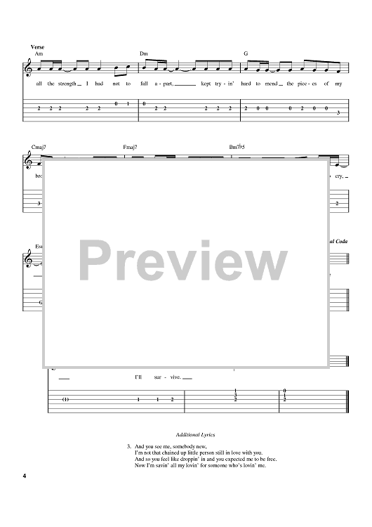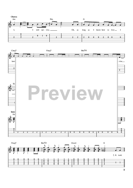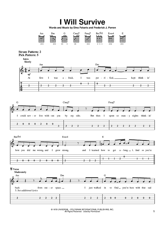 Digital Sheet Music for I Will Survive by Dino Fekaris, Gloria Gaynor, Frederick J. Perren, Chantay Savage scored for Easy Guitar Tab; id:387956