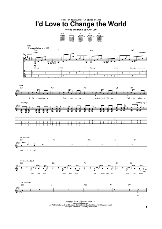 Digital Sheet Music for I'd Love To Change The World by Alvin Lee, Ten Years After scored for Guitar Tab; id:381595