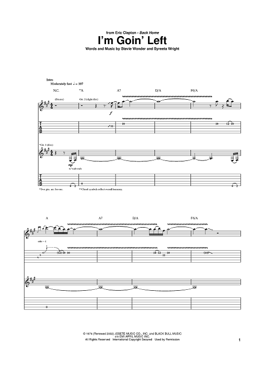 Digital Sheet Music for I'm Goin' Left by Eric Clapton, Stevie Wonder, Syreeta Wright scored for Guitar Tab; id:389101