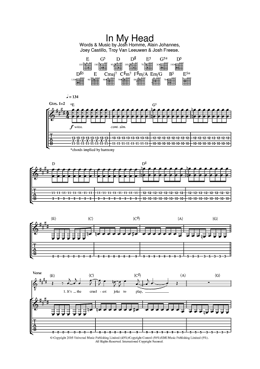 Digital Sheet Music for In My Head by Joey Castillo, Josh Freese, Josh Homme, Alain Johannes, Queens of the Stone Age, Troy Van Leeuwen scored for Guitar Tab; id:385432