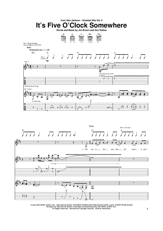 Digital Sheet Music for It's Five O'Clock Somewhere by Al Jackson Jr, Jimmy Buffett, Jim Brown, Don Rollins scored for Guitar Tab; id:386087