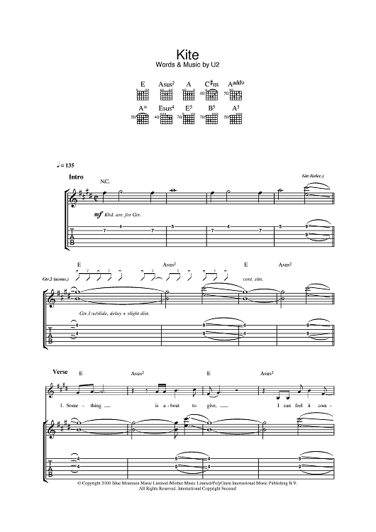Digital Sheet Music for Kite by U2, Bono, The Edge scored for Guitar Tab; id:384170