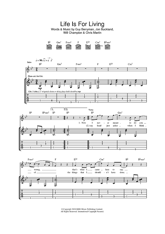 Digital Sheet Music for Life Is For Living by Chris Martin, Coldplay, Jonny Buckland, Guy Berryman scored for Guitar Tab; id:384830