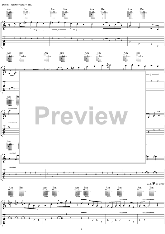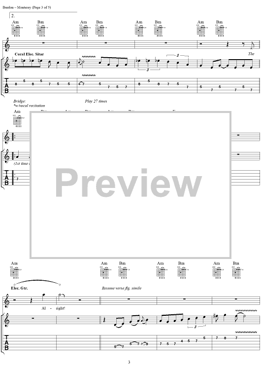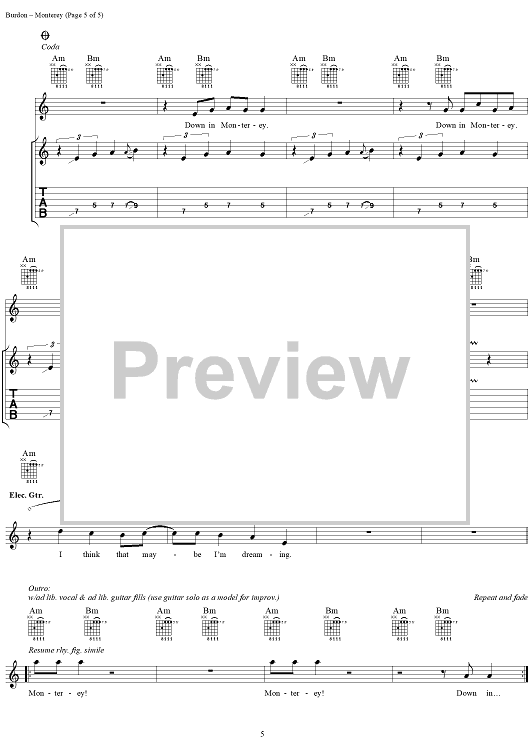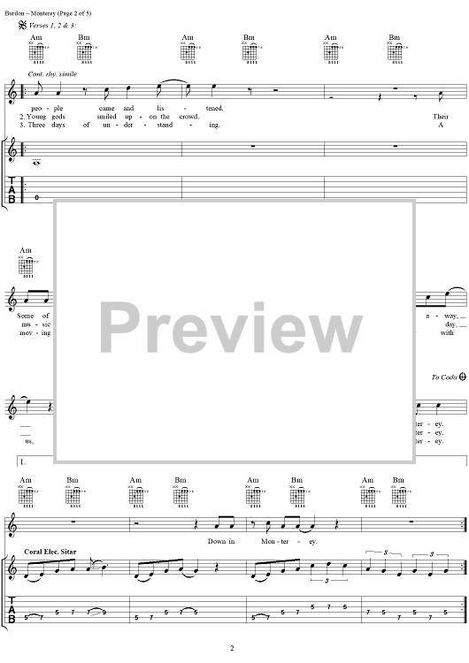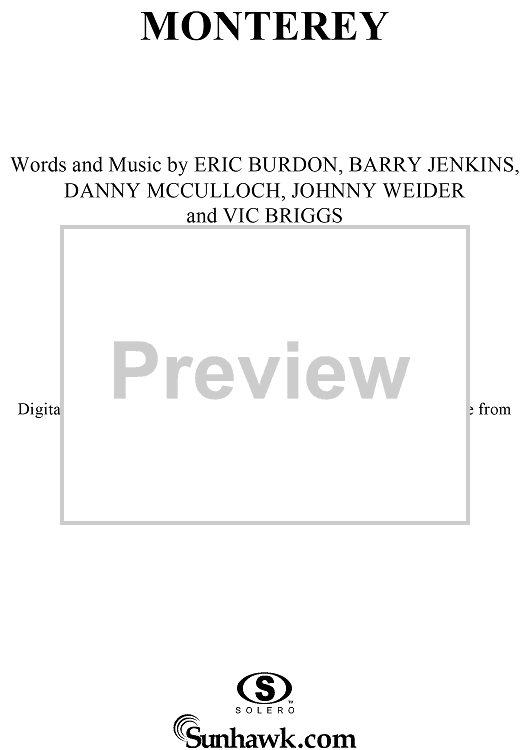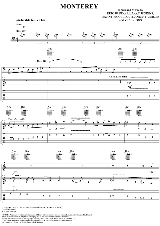 Digital Sheet Music for Monterey by The Animals, Eric Burdon, Barry Jenkins, Danny McCulloch, Johnny Weider, Vic Briggs scored for Guitar Tab/Vocal; id:303172