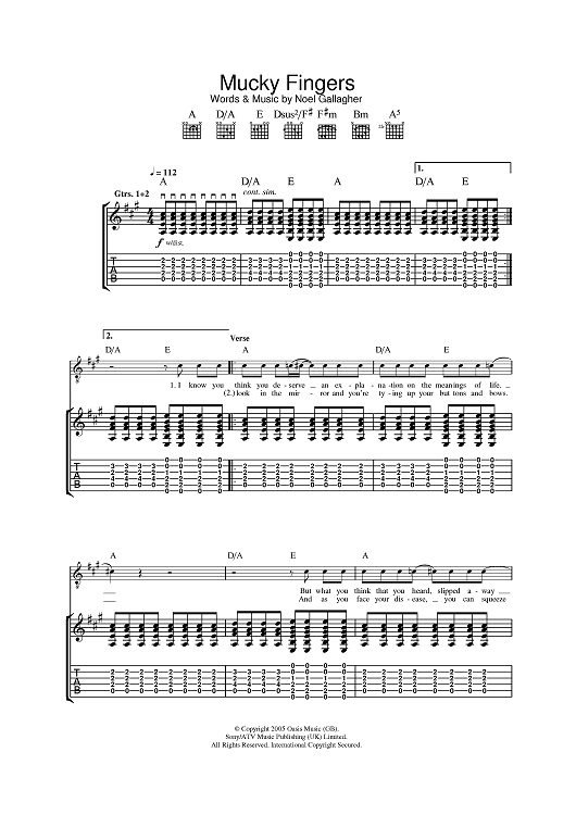 Digital Sheet Music for Mucky Fingers by Noel Gallagher, Oasis scored for Guitar Tab; id:387167