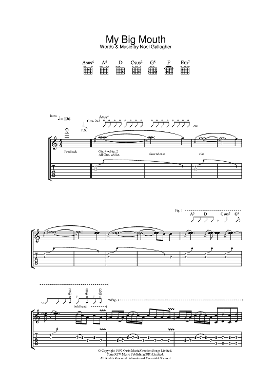Digital Sheet Music for My Big Mouth by Noel Gallagher, Oasis scored for Guitar Tab; id:385687