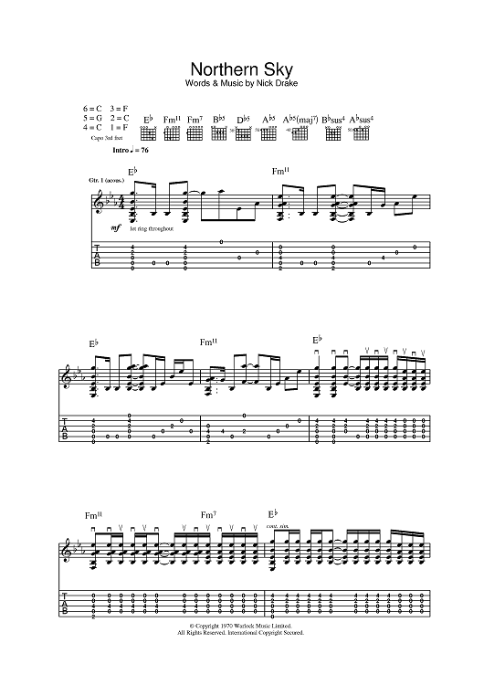 Digital Sheet Music for Northern Sky by Nick Drake scored for Guitar Tab; id:386364