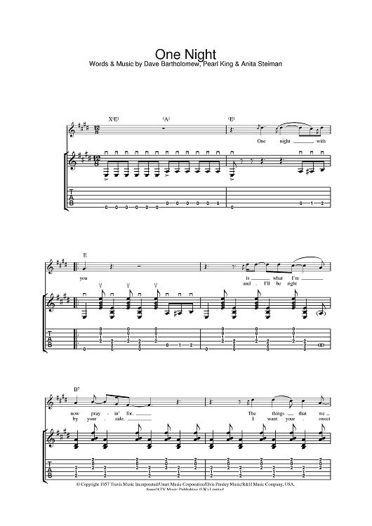 Digital Sheet Music for One Night by Elvis Presley, Pearl King, Dave Bartholomew, Anita Steiman scored for Guitar Tab; id:384026