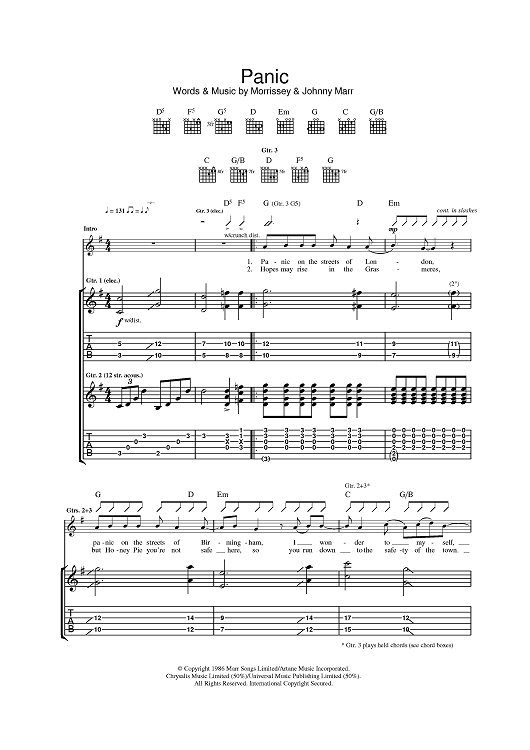 Digital Sheet Music for Panic by Johnny Marr, The Smiths, Morrissey scored for Guitar Tab; id:386980