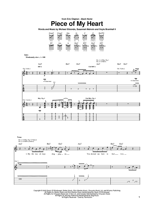 Digital Sheet Music for Piece Of My Heart by Eric Clapton, Susannah Melvoin, Mike Elizondo, Doyle Bramhall II scored for Guitar Tab; id:389093