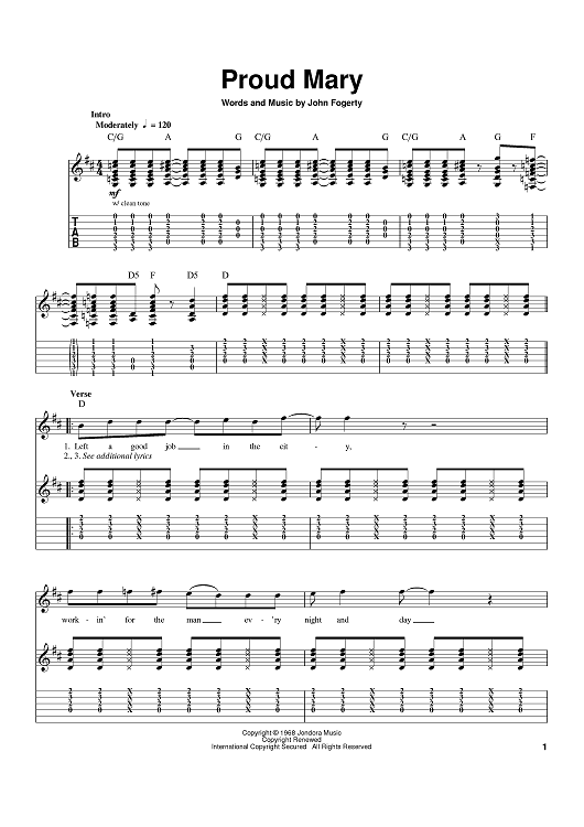 Digital Sheet Music for Proud Mary by John Fogerty, Creedence Clearwater Revival, Ike & Tina Turner scored for Guitar Tab; id:388834