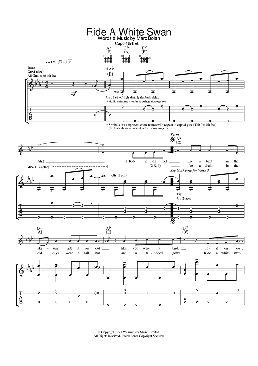 Digital Sheet Music for Ride A White Swan by T.Rex scored for Guitar Tab; id:378843