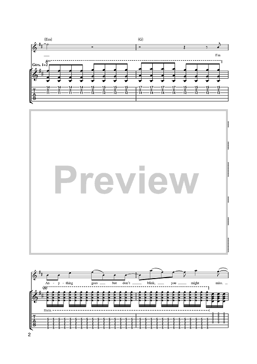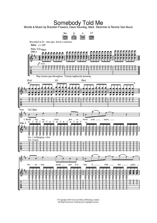 Digital Sheet Music for Somebody Told Me by Brandon Flowers, Dave Keuning, The Killers, Mark Stoermer, Ronnie Van Nucci, Ronnie Vannucci Jr. scored for Guitar Tab; id:384325