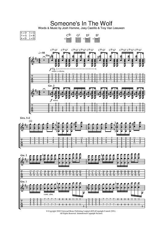 Digital Sheet Music for Someone's In The Wolf by Joey Castillo, Josh Homme, Queens of the Stone Age, Troy Van Leeuwen scored for Guitar Tab; id:385435