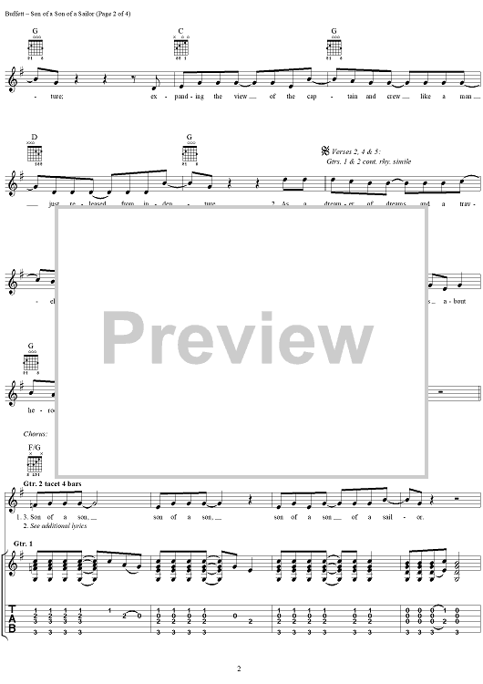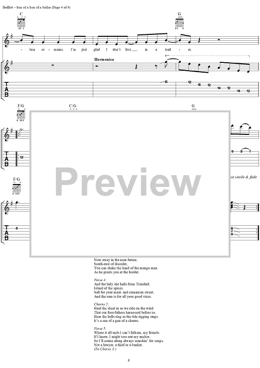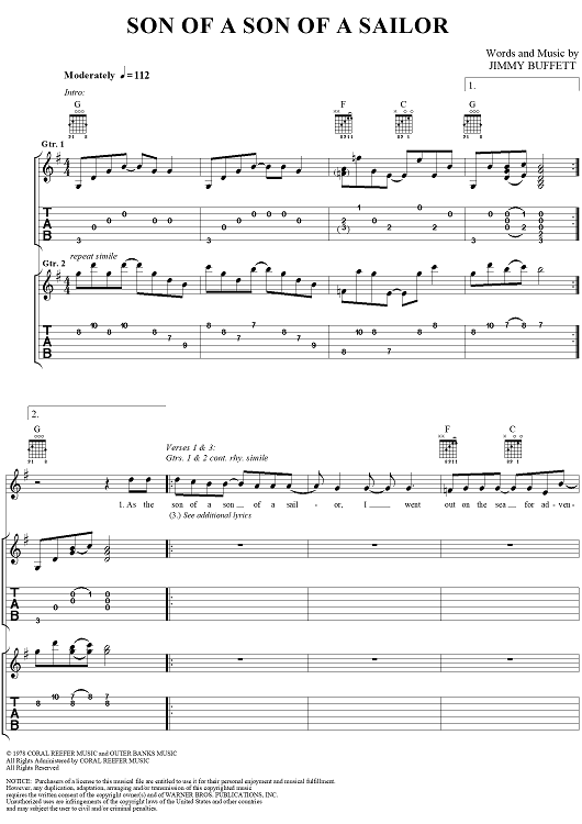 Digital Sheet Music for Son of a Son of a Sailor by Mike Taylor, Jimmy Buffett scored for Guitar Tab/Vocal; id:284353