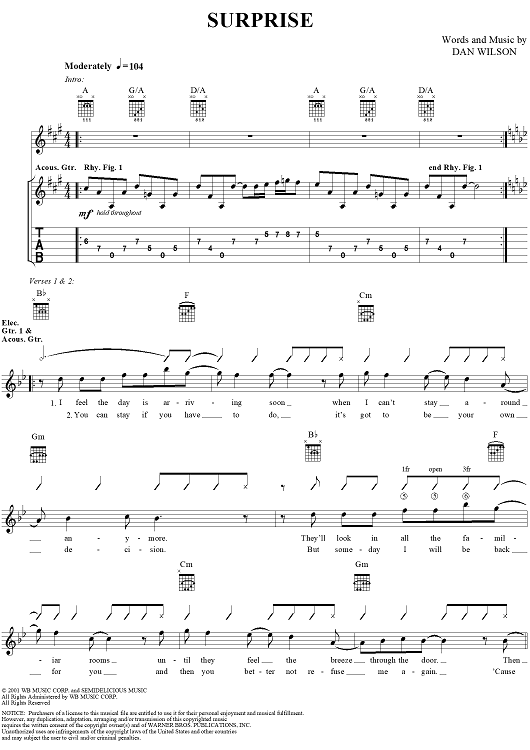 Digital Sheet Music for Surprise by Semisonic, Dan Wilson scored for Guitar Tab/Vocal; id:285291