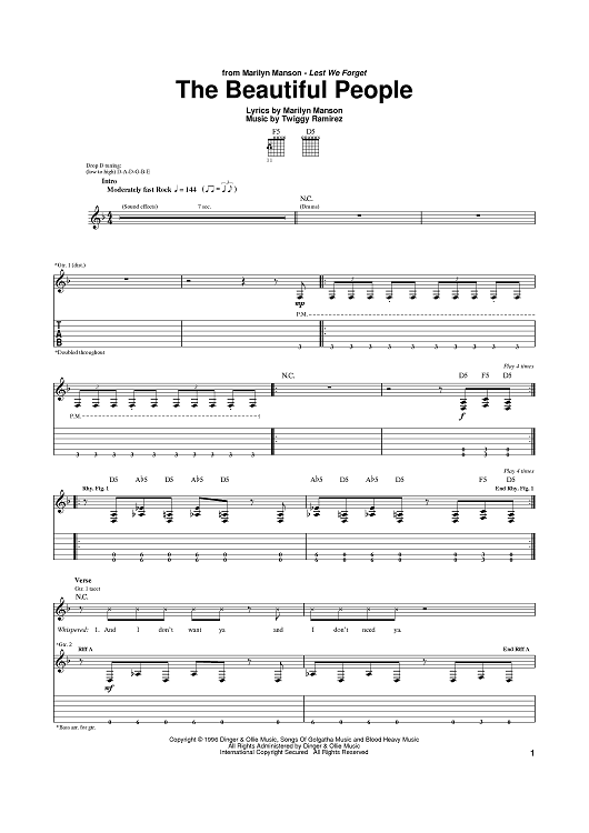Digital Sheet Music for The Beautiful People by Marilyn Manson, Twiggy Ramirez scored for Guitar Tab; id:384627