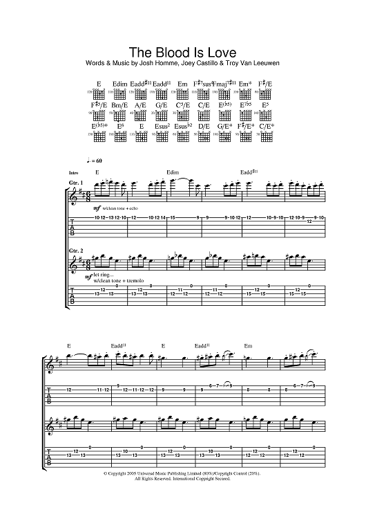 Digital Sheet Music for The Blood Is Love by Joey Castillo, Josh Homme, Queens of the Stone Age, Troy Van Leeuwen scored for Guitar Tab; id:385436