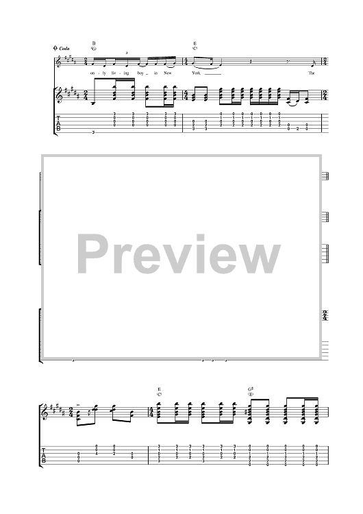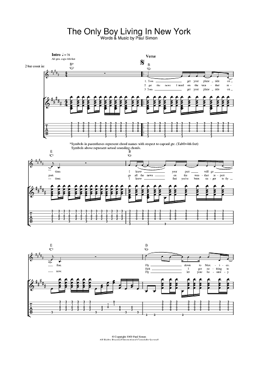 Digital Sheet Music for The Only Boy Living In New York by Paul Simon, Simon & Garfunkel scored for Guitar Tab; id:380859