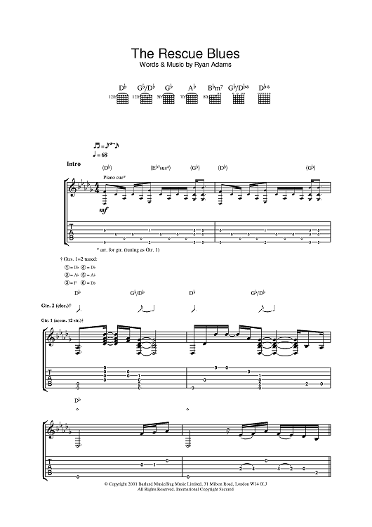 Digital Sheet Music for The Rescue Blues by Ryan Adams scored for Guitar Tab; id:384197