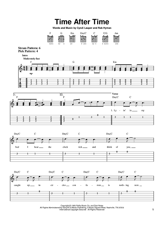 Digital Sheet Music for Time After Time by Cyndi Lauper, Rob Hyman scored for Easy Guitar Tab; id:387968