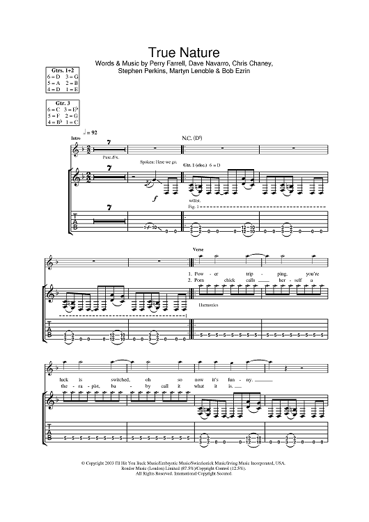 Digital Sheet Music for True Nature by Bob Ezrin, Chris Chaney, Perry Farrell, Jane's Addiction, Martyn Lenoble, Dave Navarro, Stephen Perkins scored for Guitar Tab; id:385414