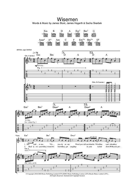 Digital Sheet Music for Wisemen by James Blunt, James Hogarth, Sacha Skarbek scored for Guitar Tab; id:387159