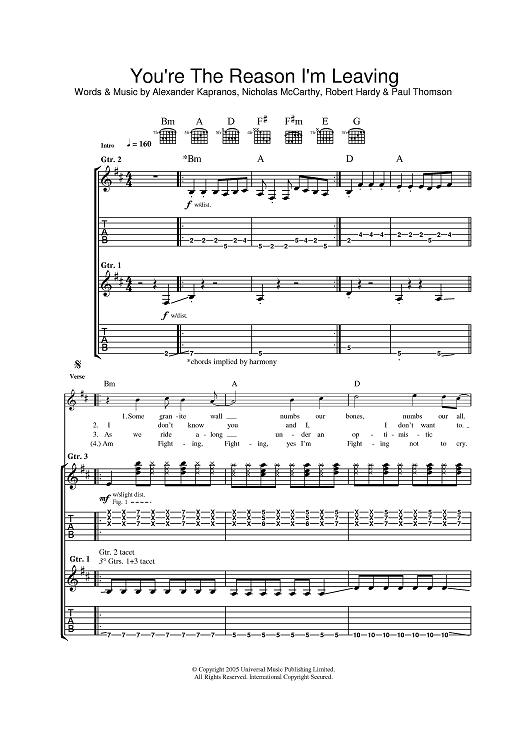 Digital Sheet Music for You're The Reason I'm Leaving by Franz Ferdinand, Robert Hardy, Alexander Kapranos, Nicholas McCarthy, Paul Thomson scored for Guitar Tab; id:387996