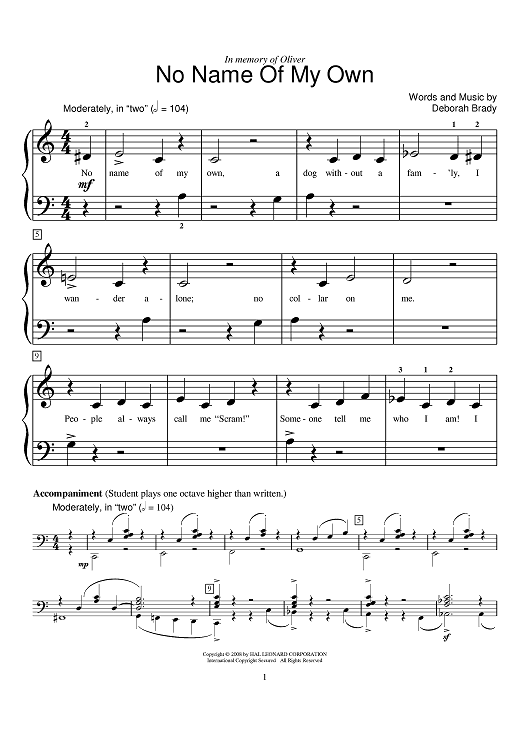 Digital Sheet Music for No Name Of My Own by Deborah Brady scored for Piano; id:402619