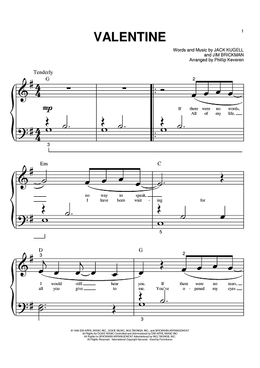 Digital Sheet Music for Valentine by Jim Brickman, Jack Kugell, Martina McBride, Phillip Keveren scored for Big Note Piano; id:396681