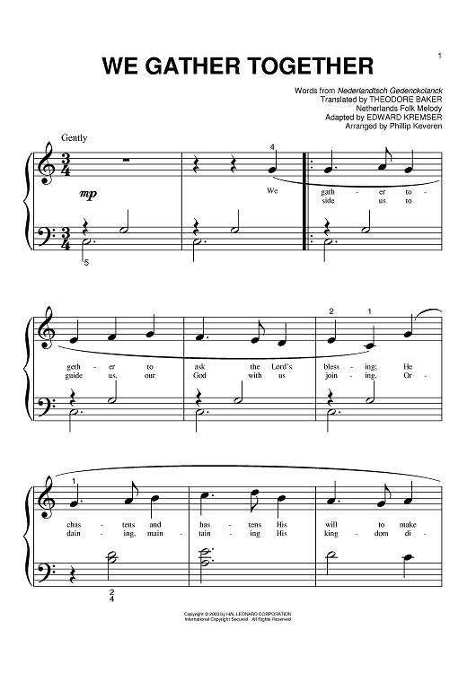 Digital Sheet Music for We Gather Together by Theodore Baker, Nederlandtsch Gedenckclanck, Phillip Keveren scored for Big Note Piano; id:372956