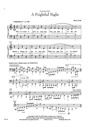 Perfect for Halloween, A Frightful Night presents staccato/legato articulations, a variety of dynamics and 8va playing. Fanciful lyrics and teacher duet highlight this wonderful piece. Young students will have a howling good time!