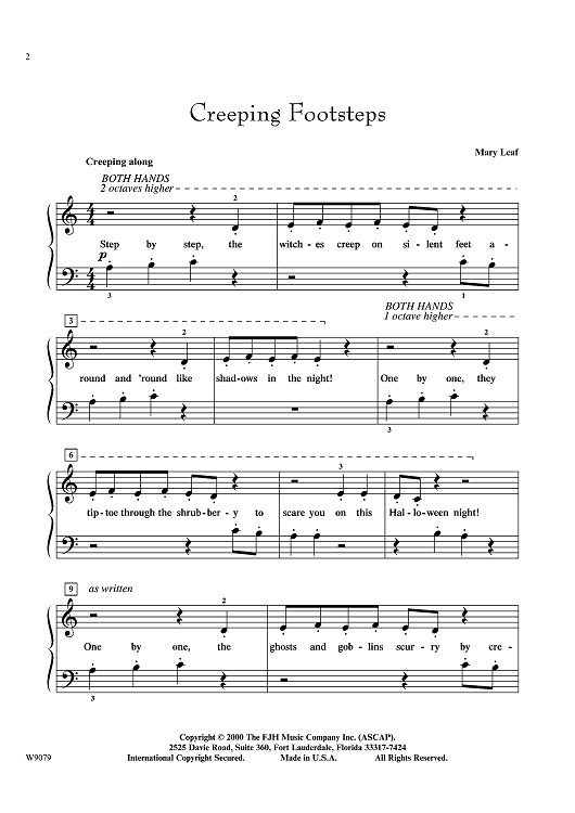 Set in Middle C position, this spooky Halloween piece focuses on soft, staccato playing throughout, with hand positions shifting by the octave.